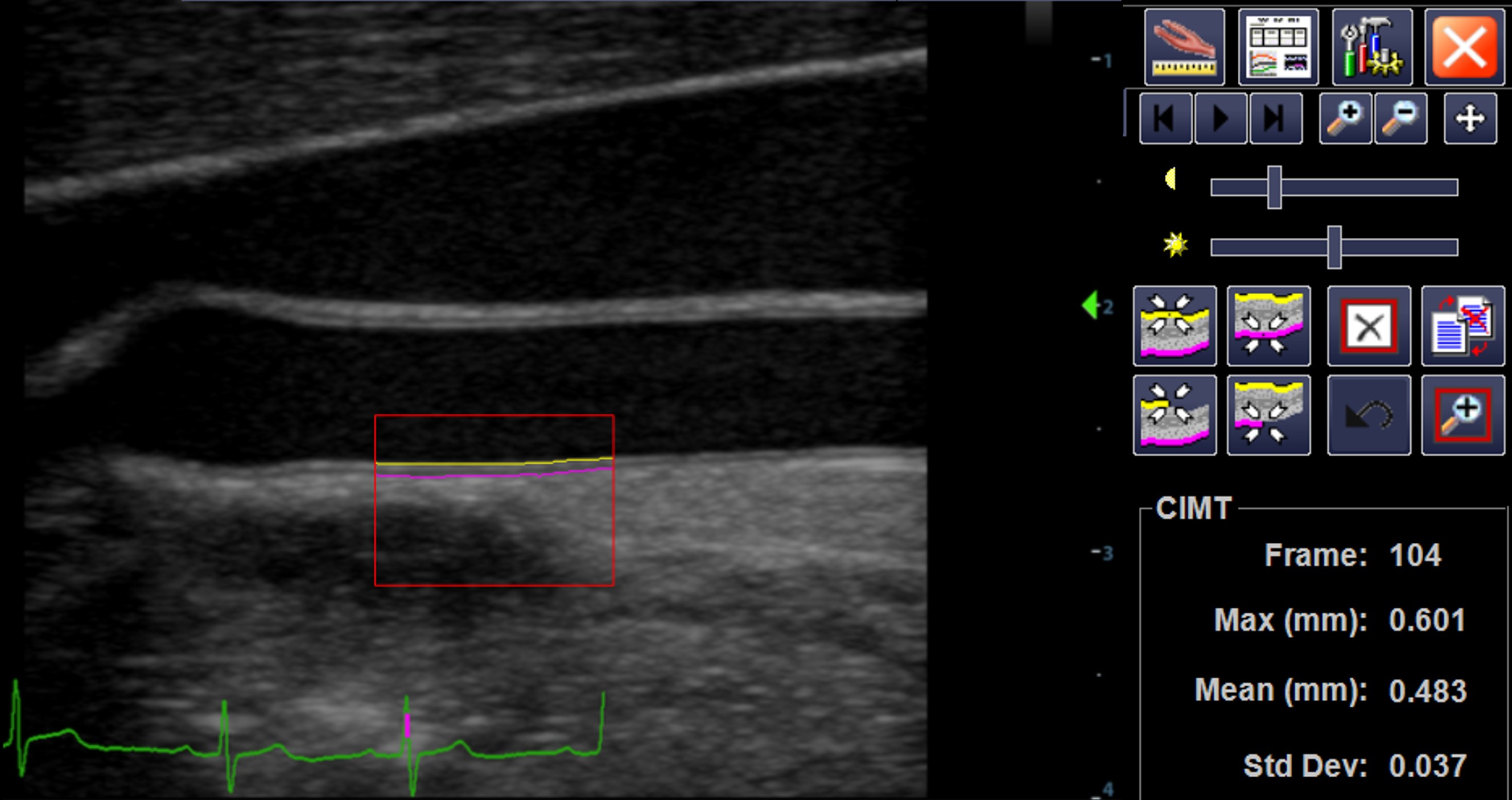 Below demonstrates measurement of far wall common carotid artery intima-media thickness.